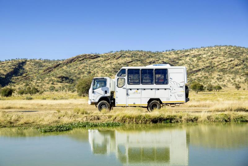 Am Nachmittag Fahrt im offenen Geländewagen zum Sonnenuntergang auf dem Gelände der Lodge (Frühstück)